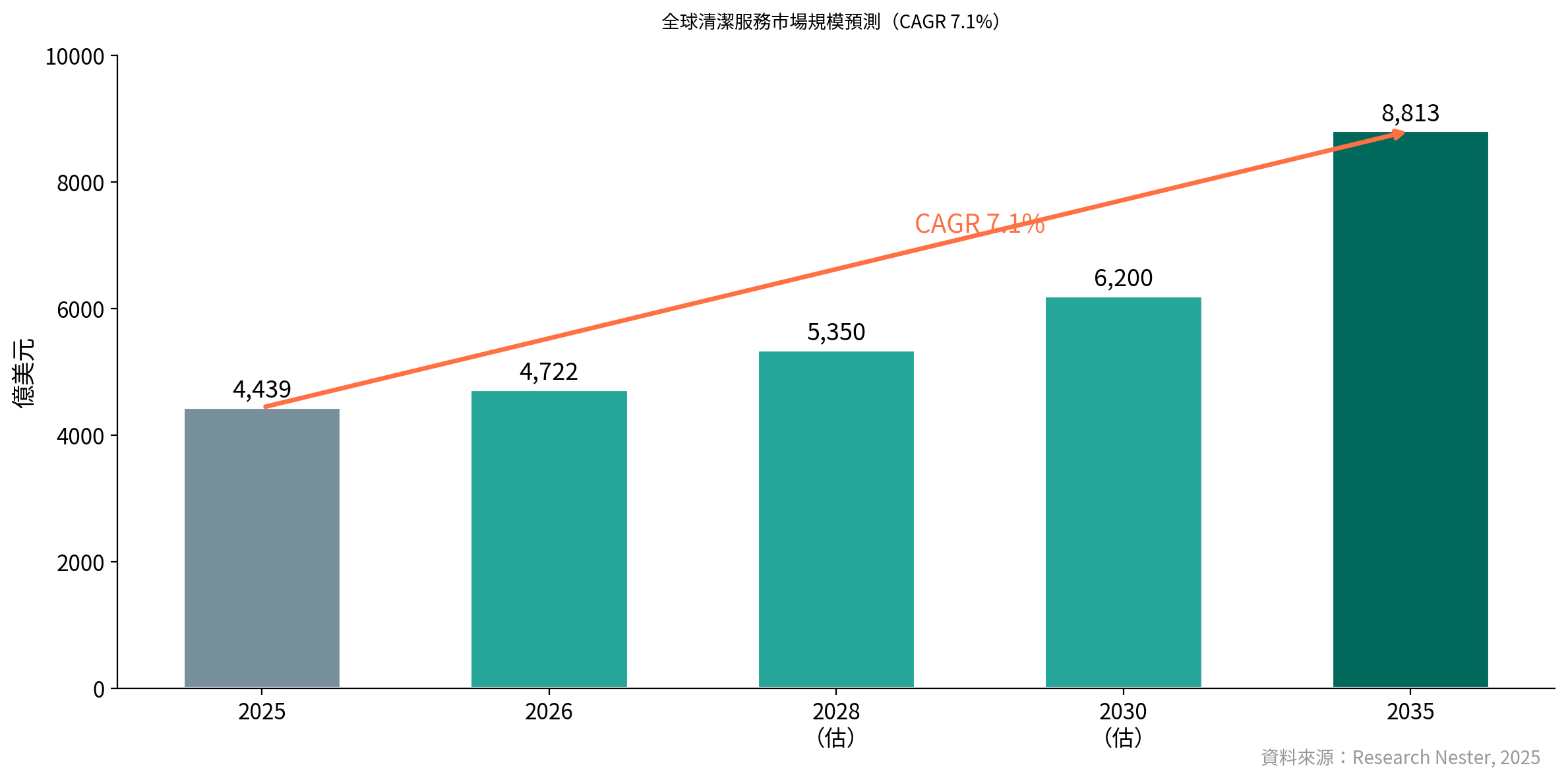 全球清潔服務市場正處於高速成長期。Research Nester 數據顯示,2025 年全球清潔服務市場規模為 4,438.6 億美元,預計以 7.1% 的年複合成長率持續擴張,2035 年將達到 8,813.3 億美元。其中,商業空間清潔佔整體市場 58.67%,是最大的需求來源。