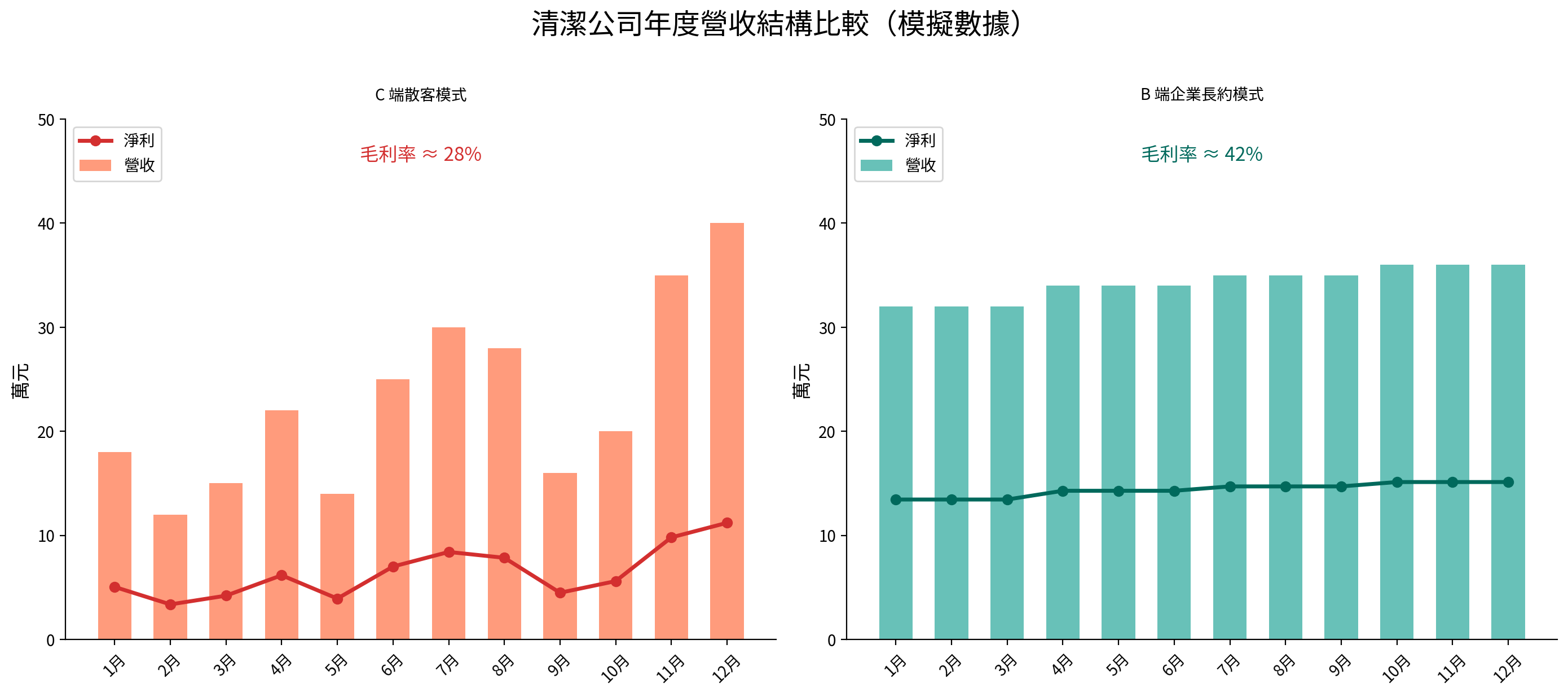 問題不在接案量,而在 C 端市場已經變成紅海——你降價,對手更低,最後大家一起賠錢。反觀那些拿到商辦大樓清潔長約的同業,每月穩定進帳,人力調度更有效率,毛利率比散客模式高出將近一倍。兩種模式的差距不只是數字,更是經營邏輯的根本不同。
